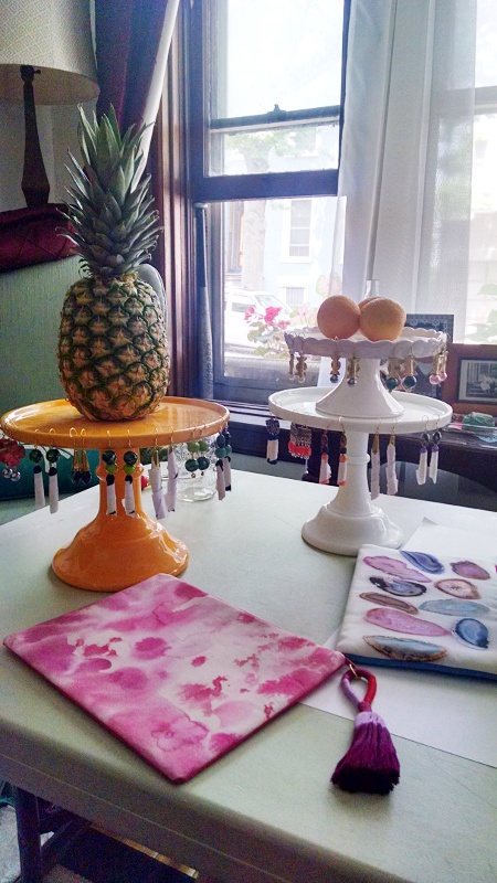 I'd bought a few cake stands in the winter that I thought would look nice with earrings hanging off of them, and the pineapple was just fun! I also got some clementines (and limes, which you don't see in the picture.)